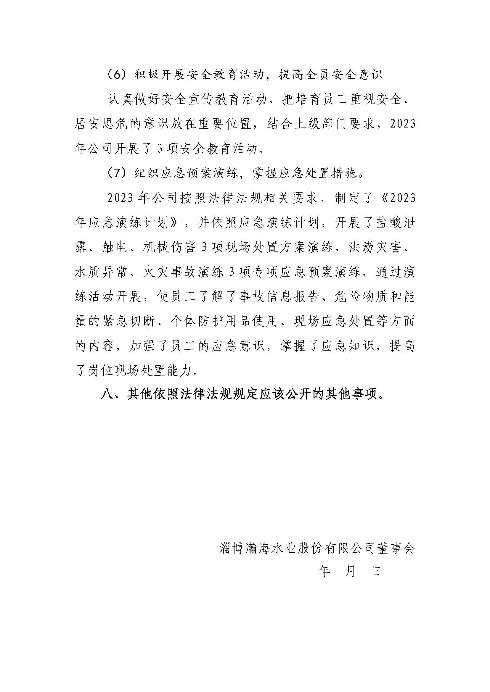 淄博瀚海水业股份有限公司2023年度重大信息公告