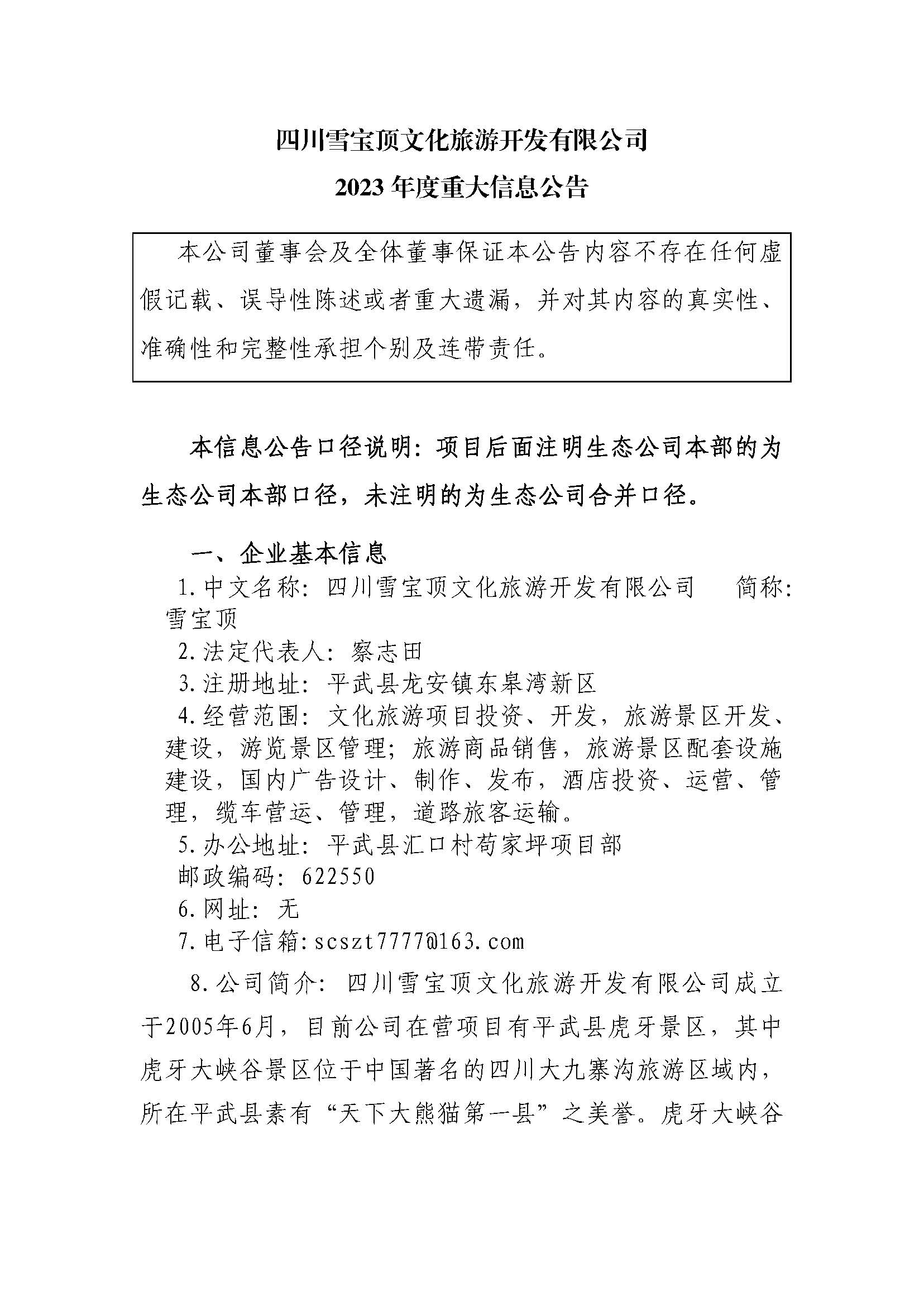 四川雪宝顶文化旅游开发有限公司2023年度重大信息公告