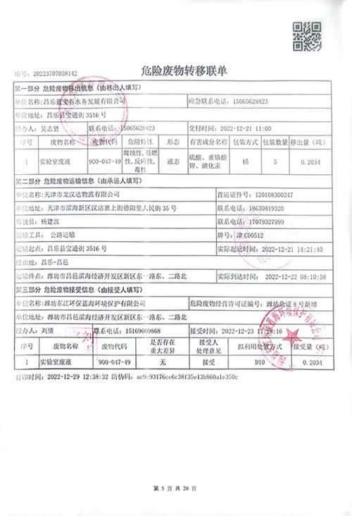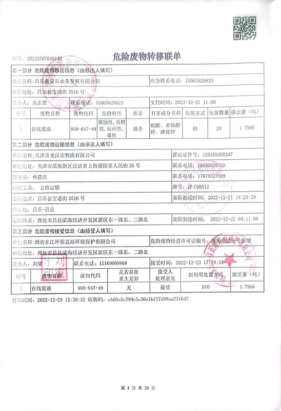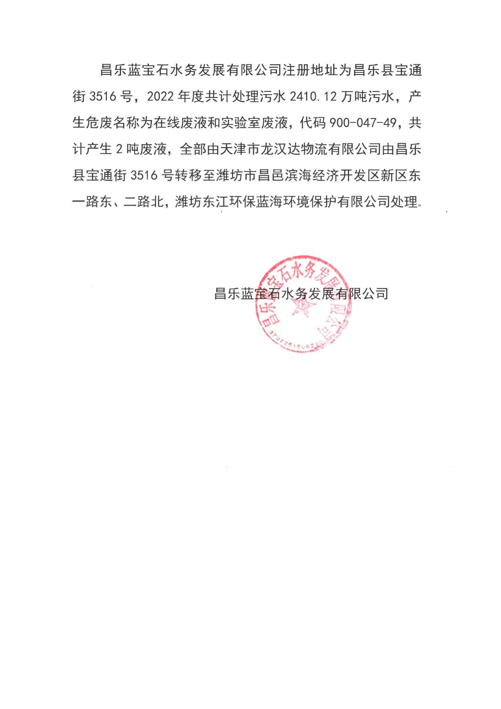 昌乐蓝宝石水务发展有限公司注册地址为昌乐县宝通街3516号,2022年度共计处理污水2410.12万吨污水,产生危废名称为在线废液和实验室废液,代码900-047-49,共计产生2吨废液,全部由天津市龙汉达物流有限公司由昌乐县宝通街3516号转移至潍坊市昌邑滨海经济开发区新区东一路东、二路北,潍坊东江环保蓝海环境保护有限公司处理。